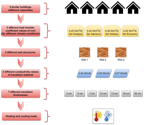 Simulations were performed to evaluate the poultry buildings’ energy consumption. Different wall types, insulation thicknesses, and thermal conductivity values, the roof’s heat transfer coefficient values, and provinces of Turkey with different climatic zones were considered.