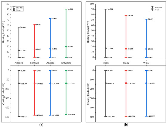 As can be seen in Figure 4a, the heating load increased from Zone 1 (Antalya) to Zone 4 (Erzurum), while the cooling load decreased. The largest heating load (90.504 kWh) was found in Erzurum province, while the largest cooling load (493.834 kWh) was found in Antalya province. When the types of walls studied were examined, Wall 3 achieved the lowest energy consumption, while Wall 1 exhibited the highest value (Figure 4b). As known, the amount of heat transferred decreases with increasing insulation thickness [62], so the highest and lowest heating/cooling loads were obtained at 3 and 20 cm (Figure 4c), respectively—in addition, the lower the insulation’s thermal conductivity, the lower the heat transfer coefficient overall. Therefore, the lowest and highest heating and cooling loads were found at thermal conductivities of 0.03 and 0.07 W/mK, respectively (Figure 4d).