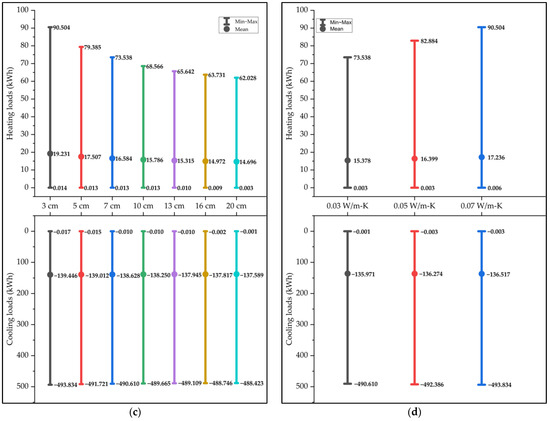 The minimum, mean, and maximum values of the EnergyPlus model for different (a) climate zones, (b) wall types, (c) insulation thickness, and (d) insulation thermal conductivity.