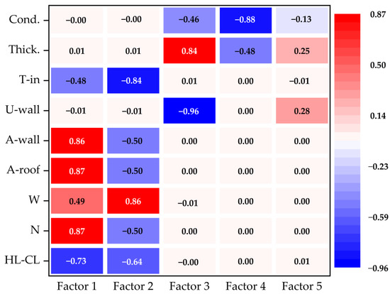 Factor analysis is often performed to develop, improve, and evaluate tests, scales, and measures [63]. Exploratory factor analysis uses a correlation matrix, one of the most popular statistical techniques, to determine the relations between variables [64]. The factor under which a variable has the greatest weight in absolute values closely relates to that factor. Tabachnick and Fidell [65] suggested checking the correlation matrix for correlation coefficients above 0.30. In this study, different variables, including thermal conductivity of insulation material (Cond.), insulation thickness (Thick.), indoor temperature (T-in), heat transfer coefficient of roof (U-roof), roof area (A-roof), wall area (A-wall), building capacity (N), bird weight (W), and heating-cooling loads (HL-CL) were selected as studied variables for factor analysis (Figure 5). Factor 1 accounts for 36% of the common-factor variance. This factor shows the variables related to the HL-CL. Therefore, five variables (N, W, A-roof, A-wall, and T-in) were considered as inputs for the designed data-driven methods (ANN, SVR, and RF).