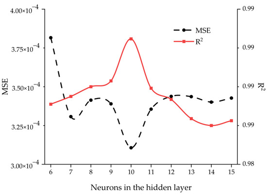 As explained in Section 3.3, the input, output, and hidden layers form the layered structure of ANN. To test the ANN model’s sensitivity, different numbers from 6 to 15 neurons were used in the hidden layer. There is no definitive answer to the question of how many neurons the hidden layer of an ANN model should contain. However, some researchers have suggested that more than twice the number of neurons in the hidden layer should be more than the number of input neurons (input variables) [66]. It has also been reported that the number of neurons generated by this statement does not essentially ensure that the network can be generalized [67]. In particular, the neurons in the hidden layer vary depending upon the problem’s nature and the training patterns’ number and quality [68]. If too few neurons are included in the hidden layers, the network may result in underfitting. If, on the other hand, too many neurons are used in the hidden layers, the network can lead to overfitting. The optimal value of the hidden layer neurons was determined after an initial experiment with ten neurons using the stepwise search method (Figure 6). Thus, we decided to use ten neurons to simplify the network.