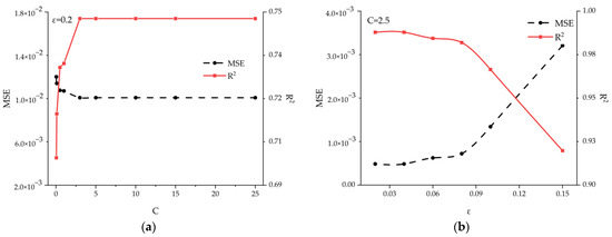 The three parameters, including the error term penalty parameter (C), kernel coefficient (γ), and radius (ε), are referred to as the SVR model’s hyperparameters. To avoid under- and overfitting, these hyper-parameters need to be chosen correctly. Chang and Lin [69] defined the kernel coefficient as = 1/K, in which K is the total number of inputs. Therefore, the heating and cooling loads in this study were estimated as γ = 1/5. The parameter C is applied to obtain a trade-off between the model’s complexity and the extent to which variations larger than ε are allowed in the optimization formulation. A small value of C gives little weight to the training data and results in a model with an inadequate fit. In contrast, an excessively large value of C minimizes only the empirical risk and leads to an inadequate fit to the training dataset. In this paper, to determine the optimal values for these hyperparameters (C and ε), a two-step grid search approach with 10-fold cross-validation was used to derive the tuning parameters in the SVR model [70]. In this approach, a coarse grid search was performed first and found that the best C and ε were 3 and 0.2, respectively, with an R2 of 0.748 (Figure 7a). Then, a finer grid search with tenfold cross-validation was performed in a zone of values optimized from the coarse grid search. This resulted in 2.5 and 0.04 for C and ε, respectively, with an R2 of 0.990 (Figure 7b).