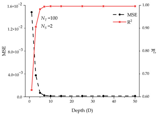 Three user-defined parameters, the number of trees (NT), the number of splits (NS), and the individual trees’ depth (D), must be specified for optimization to develop the RF models [71]. In this paper, a stepwise search procedure was performed, and the range of 1–200, 2–10, and 1–50 were considered for the NT, NS, and D, respectively. It was found that NT and NS did not enhance the model’s performance drastically, so default values of 100 and 2 were chosen for these parameters, respectively. In contrast, D enhanced the prediction results greatly, i.e., for values of D equal to 1 and 10, the models have R2 values of 0.630 and 0.993, respectively (Figure 8). After a value of D = 10, there was no considerable improvement in the model’s predictive ability, and therefore, D = 10 was used in further experiments.