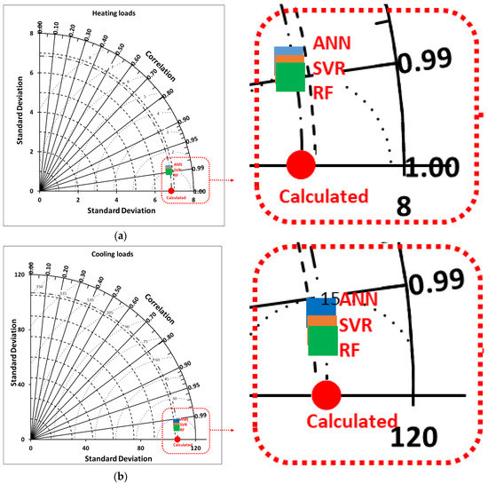 A Taylor diagram was used as well to examine the R and SD between the predicted and calculated heating and cooling loads for the ANN, SVR, and RF models. This is shown in Figure 9a,b for all models considered, where the RMSE difference is measured as a function of the distance from the reference point (i.e., the calculated value). The point with the highest R and lowest RMSE is the most excellent predictive model. The visual representation of the model reveals that the results of the RF model match the calculated data points much better than those of the ANN and SVR models.