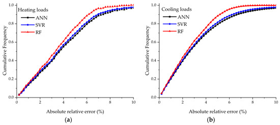 Cumulative frequency vs. absolute percent relative error for the models studied for (a) heating and (b) cooling loads in testing data.