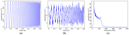 Figure 2 shows the basic characteristics of the (Figure 2a,b) time and (Figure 2c) frequency domains of the signal, which varies linearly in frequency. It can be observed from the frequency spectrum that the difference between constant-frequency step signal and linear frequency-varying signal is that the frequency of the latter changes linearly, and the frequency content ranges between 20 and 120 Hz. As previously stated, it is not possible to see when a certain frequency occurs by looking at Figure 2c.