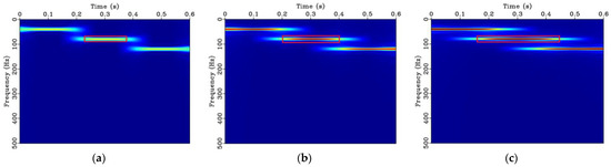 Figure 5 shows the time-frequency spectra calculated by the LTFT with three different smoothing radii. It can be observed that although there is no significant difference in the time and frequency resolution obtained by the three different smoothing radii, the overlap between the frequency peaks in the time domain increases with increasing smoothing radius. The red boxes in Figure 5 highlight the actual frequency cut-off locations for the example of the 80 Hz peak, which are 0.2 and 0.4 s. Analogous to the STFT, an appropriate smoothing radius should be selected based on the signal analyzed.