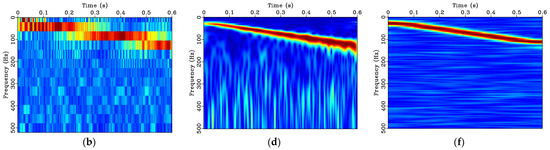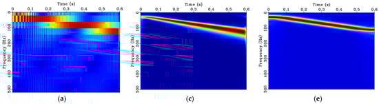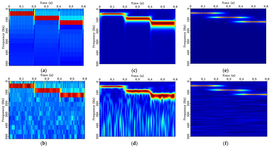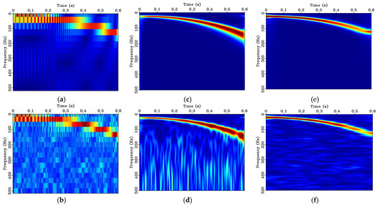 Next, the three synthetic signals are processed using the STFT (window length = 21 points), ST, and LTFT (smoothing radius = 15 points). Figure 6a,b shows, respectively, the time-frequency spectra of the constant-frequency step signal and its noisy version processed by the STFT. It can be seen that this method can effectively capture all three frequency components. However, owing to the limitation that the frequency resolution is relatively low, if a wider time window is chosen to increase the frequency resolution, the time resolution capability would be lost (see discussion around Figure 4). Figure 6c,d shows the time-frequency spectra of the S transformed signals. The ST offers better time-frequency resolution, especially at low frequencies, while the time-frequency resolution is lower at higher frequencies. It can further be observed that the ST cannot effectively capture the distinct changes in frequency. In addition, like the STFT, the ST spectrum shows notable high-frequency noise for the noisy version of the signal (Figure 6b,d). Figure 6e,f is the result of the LTFT, which has high-resolution regardless of time direction and frequency direction. Not only can it effectively represent the changes at the step edges of the signals, but it is also significantly less sensitive to noise compared to the STFT and ST.