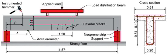 The T-girder used in this study was made of RC and simply supported having a span length of 4.57 m. The concrete’s average cylinder compressive strength was = 27.6 MPa and steel reinforcing bars (rebars) had a design yield strength, = 414 MPa. A single load cycle was applied to induce service-level flexural cracking around mid-span of the girder. An elevation view and the cross-section of the girder are provided in Figure 9. More details of this test specimen can be found in [34].
