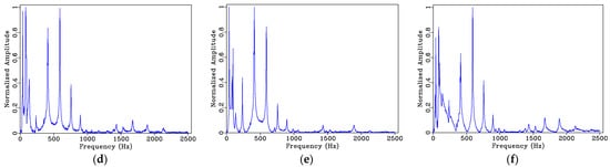 Normalized pre-damage acceleration response signal spectra (frequency domain): (a) un8-2; (b) un8-8; (c) un8-14; (d) un14-2; (e) un14-8; (f) un14-14.