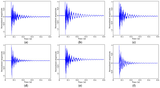 Normalized post-damage acceleration response signal: (a) cr8-2; (b) cr8-8; (c) cr8-14; (d) cr14-2; (e) cr14-8; (f) cr14-14.