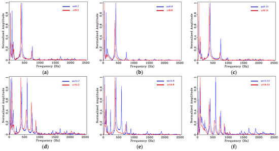 Normalized pre-damage and post-damage acceleration response signal spectra: (a) un8-2 and cr8-2; (b) un8-8 and cr8-8; (c) un8-14 and cr8-14; (d) un14-2 and cr14-2; (e) un14-8 and cr14-8; (f) un14-14 and cr14-14.