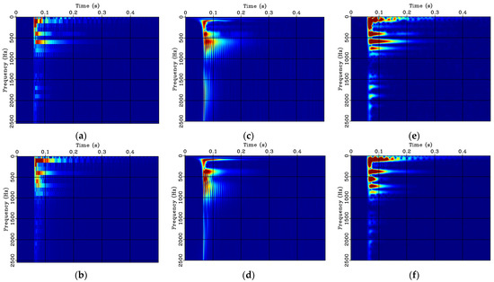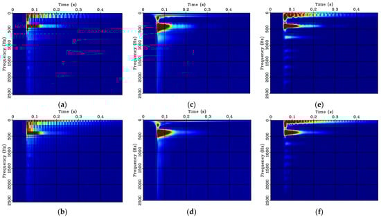 Time-frequency spectra of un8-8 and cr8-8: (a) STFT of un8-8; (b) STFT of cr8-8; (c) ST of un8-8; (d) ST of cr8-8; (e) LTFT of un8-8; (f) LTFT of cr8-8.