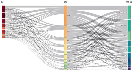 The three-field plot gives an insight on the countries with the highest scientific production and the major sources related to BIM, IoT and DT and the connected keywords. In addition, it shows the relationship between them. The plot was created using Biblioshiny. In Figure 2, it is possible to see how the keywords BIM, IoT, DT and FM are strongly connected to the United Kingdom (UK), Australia and China. Moreover, the major sources for these topics are the journals Buildings and Automation in Construction, in addition to Sustainability. In particular, the journal Buildings is strongly connected to the topics of BIM, DT, FM, blockchain, IoT and Industry 4.0, whereas Automation in Construction is connected to Artificial Intelligence (AI) as well. Meanwhile, Sustainability, besides the focus on the first three keywords, has a strong flow towards Construction 4.0. From this first analysis, different concepts pop up that are connected to the key topics introduced in Section 1, particularly the terms blockchain, AI, industry 4.0, construction 4.0 and AR. The term blockchain refers to the technology at the base of cryptocurrencies [26] and indicates a “type of distributed database” [27], which is able to make information available in “different geographical locations such as multiple sites, countries, or organizations” [27]. Its principal feature is the absence of a “central administrator or centralized data storage mechanism” [27]. Even if its first application was for cryptocurrencies, this technology can be applied also in other fields [28], such as the construction sector [27], even for the FM activities. Specifically, studies have shown how its application for assets’ management can improve the efficiency of data sharing and protection, with benefits for interoperability and cost reduction [29,30]. Besides, AI and its subfields, such as ML, are catching on and their applications in various industry sectors, including the construction one, are being studied [31]. In particular, ML has been employed in FM as a method for classifying and predicting anomalies of assets in the building such as HVAC [32]. Besides, the AI applications studies have enhanced the rise of other technologies, such as the previously cited blockchain [31]. The terms industry 4.0 refers to the fourth industrial revolution [33] and is based on the advent of new technologies, including IoT and DT, in the sector [34]. The term Construction 4.0 is the relative declination of industry 4.0 in the construction sector and is equally based on new trends and technologies [35].