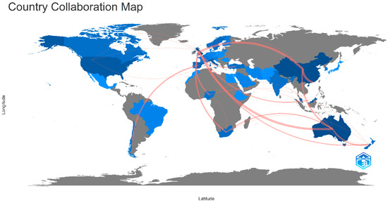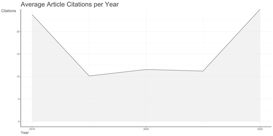 The trend in the graph about the average citations per year, shown in Figure 4, does not match the one about the annual scientific production. Form 2020, there is a decrease of the trend that stabilizes itself between 2019 and 2021 and displays an increase from 2021. The decrease from 2019 to 2021 could be caused by a decrease of international collaboration, since it has been studied how there is a correlation between the number and type of collaborations and the number of citations [37,38].