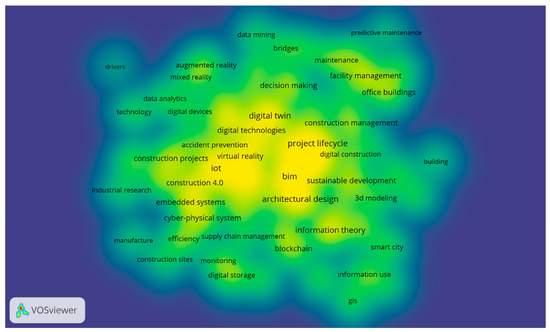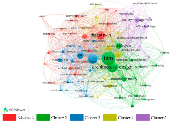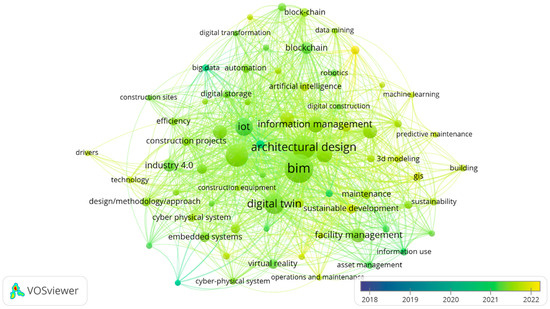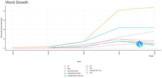 Keywords such as construction 4.0 and industry 4.0 are also present and are connected to the transformation of these sectors due to the introduction of new technologies such as BIM, DT and IoT. Their growth is visible until 2021, when construction 4.0 suffers an evident decreasing trend, while the industry 4.0 displays a light increase. The words blockchain, connected to the use of IoT technologies and BIM for information storage and validation, follows a similar pattern. The word FM has an upward trend from 2020, without any decrease. This graph shows how these topics are gaining interest in the research area; in particular, the upward trend of BIM, IoT, DT and FM is evident, besides the other words connected to these subjects. In addition, the word AI undergoes an increasing trend from 2020 onwards.