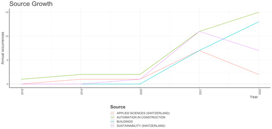 The temporal evolution of keywords from 2018 and 2022 is provided in the Figure 5. The graph shows the evolution of the ten most important keywords used by the authors. It is evident that the most used keywords with the biggest growth in 2020 are BIM and DT, proving how scientific production is increasingly focusing on the investigation of these topics.