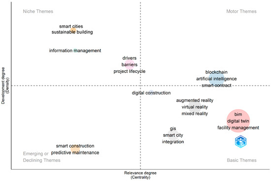 The analysis of the words’ dynamics confirmed BIM as the most indagated topic, followed by DT and the increasing interest for the FM area. Other connected themes emerged, such as blockchain, AI, AR, ML and construction industry 4.0. In particular, many studies have shown the potential application of blockchain in FM and is considered both with DT, IoT, AI, AR and others technologies at the base of the digitalization of FM [36]. The analysis of authors revealed that the first ten most productive ones are from the UK, Australia, China, Hong Kong, USA and Norway, a trend that mostly matches the analysis of the countries’ scientific production and most relevant affiliations. The authors’ collaboration network analysis reveals, as anticipated, small research groups with a low degree of collaboration. An analysis of the most cited documents showed that the first three most cited ones are reviews, which are known to be more cited compared to other types of articles [38]. Successively, a source analysis was conducted and enabled to identify the principal sources for the indagated topics. The analysis revealed that the core sources are Automation in Construction, Building, Sustainability and Applied Sciences, with Automation in Construction having the highest number of published documents and the source with the highest impact in the studied field. The country collaboration map shows strong collaboration between China and Hong Kong, China and the UK and the UK and Australia. This pattern can be also captured in the provenience of the members of the research group. Finally, an analysis of the bibliometric networks with the software VOSviewer was conducted. The co-occurrence keywords network analysis showed the presence of five cluster. The first one regarding DT, the second one BIM, the third one construction industry, the fourth one information management and the fifth one FM. The map shows a high level of links between all the clusters. The DT cluster contains words that point out its application in the construction sector; in particular, in the O&M phase. The BIM cluster points out to the importance of information and the use of BIM in this sense, whereas the construction industry cluster evidence the digital transition, in which the sector is headed. In the yellow cluster, the term blockchain is also present, together with the word smart contract, which testify its applications in the construction sector for the information management, together with BIM [68]. The FM’s cluster includes terms such as “predictive maintenance” and “digitalization”, affirming the future direction for the sector. The overlay visualization (Section 3.6.2) matches the trend in word dynamics, with most of the word occurrence in the last two years. Finally, a thematic map analysis was performed, dividing the themes according to their density and relevance degree.