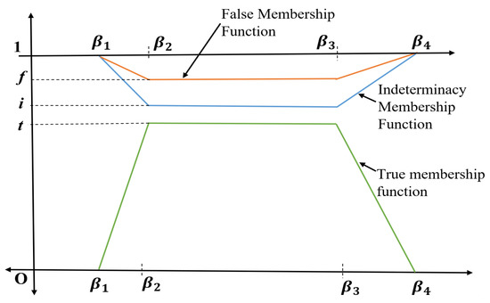 are shown in Figure 2 where are first, second, third and fourth entry of the trapezoidal neutrosophic numbers respectively and for maximum true membership value, for maximum indeterminacy membership value and for maximum false membership value of TrNN .