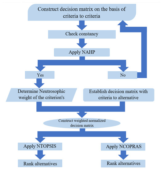In this research, Section 1 covers the introduction and the literature review of neutrosophic number and its application in MCDM as described in Section 2. Section 3 covers preliminaries and different operations of neutrosophic numbers with distance and de-neutrosophication technique of TrNN. MCDM mathematical formulation is mentioned in Section 4. In particular, NAHP is described in Section 4.1, TrNN weight is expressed in Section 4.2, Section 4.3 described NTOPSIS and NCOPRAS described in Section 4.4. The model for setup and Criteria of the application are shown in Section 5 and Section 6, respectively. Data collection and Numerical calculations are mentioned in Section 7 and Section 8, respectively. Sensitivity analysis is described in Section 9. Finally, the conclusion and future research scope are discussed in Section 10.