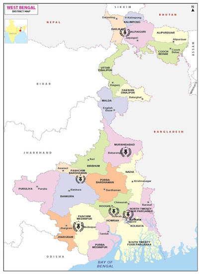 - West Bengal District Map. MapsofIndia.com. Available online: https://www.mapsofindia.com/maps/westbengal/westbengal-district.htm (accessed on 25 October 2022).