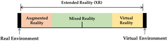 Extended reality (XR) represents various immersive technologies that have been developed to improve user experience and enhance their feelings [2]. XR includes virtual reality (VR), augmented reality (AR), and mixed reality (MR) (the spectrum of VR, AR, and MR is shown in Figure 1). As shown in Figure 1, VR focuses on providing a complete virtual immersive environment that isolates the user from the real world. In contrast, AR and MR aim to blend virtual elements with the real environment. Specifically, AR emphasizes the superposition of virtual elements in the real environment. In contrast, MR could help to blend virtual elements and real environments completely. Through MR, users can interact with elements from both real and virtual environments simultaneously, and elements from the real and virtual environments can also interact [3]. VR has the potential to shield from on-site hazards and provide immersive and interactive virtual construction environments. AR and MR have the potential to support on-site information retrieval and access and real-time information transfer [4,5,6]. As proved by many scholars and industry practitioners, XR could be used as a potential tool to improve the information exchange process among humans, cyber processes, and environments during construction management. At present, XR has been preliminarily applied in the progress inspection [6,7,8], operation instruction [9,10,11], quality inspection [12,13], hazard identification [14,15], safety education and training [16,17], safety inspection [18,19,20], and other aspects of the construction site. Based on the above XR use cases, limitations of XR still exist. It is thus necessary to further improve the existing XR-based techniques for supporting effective control of construction progress, quality, and safety. Specifically, the authors have presented a vision of using XR for safe and effective construction management (shown in Figure 2).