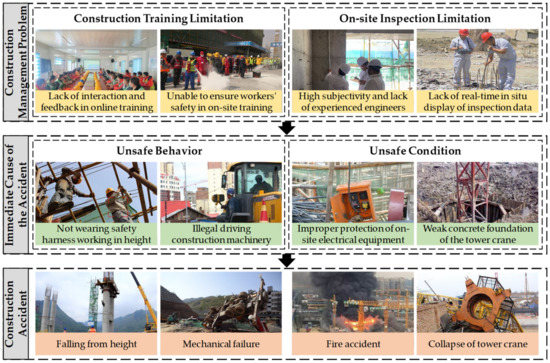 As shown in Figure 3, a collapse accident of a tower crane occurred in Huarong County, Hunan Province, China. The accident killed five people and caused more than RMB 5.8 million in direct economic losses. Accident reports indicate that the root cause of this accident was workers’ illegal disassembly operations, which caused the crane component to fall off. The managerial cause of this kind of accident can be summarized as follows. On the one hand, existing safety training on-site heavily relies on passive teaching methods (e.g., lectures, manuals, and videos). However, all such passive teaching methods lack real experience and could hardly achieve effective safety training for workers [25]. Therefore, it is necessary for the construction management domain to develop effective safety training programs with training environments that are interactive and free of security risks. On the other hand, experienced engineers are limited human resources at construction sites, which creates challenges in providing sufficient supervision and instructions for newly admitted construction personnel, and field engineers cannot fully and accurately detect all hazards and propose solutions on time [26,27]. In addition, the inspected information about quality or safety hazards cannot be directly displayed at construction sites, which leads to the failure of on-site workers to obtain this information [28]. Therefore, it is necessary to study the automatic method of quality control and safety inspection at construction sites and the effective transfer mechanism of risk information.