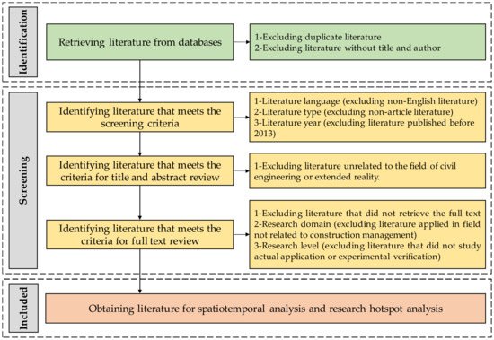 The keyword set related to “construction engineering and management” (CRK) involves many topics. In addition, since the purpose of this study is to explore the application status of XR in the construction field of “three control, three management, and one coordination”, this study selected keywords not only from the overall perspective of “construction” or “AEC”, but also from the perspective of progress, quality, and safety. In this study, the following three methods are combined to select keyword sets: keyword co-occurrence analysis by using Citespace 5.8.R3, reference to previous review articles on extended reality and construction, and professional experience. In the management system of “three control, three management, and one coordination”, “information management” focuses on the research of “information management system”, “database”, and other related aspects [35,36,37]. The literature retrieved mainly belongs to the field of computer science, and the extended reality itself is the database. “Organizational coordination” belongs to pure management. “Organizational coordination” is mainly related to organizational structure, job responsibilities, and the development of organizational management measures, whereas the extended reality focuses on technical aspects. The above two aspects deviate from the theme of the application of extended reality in construction management, so they are not within the scope of this review. Therefore, the set of keywords related to “construction engineering and management” was finally identified as: