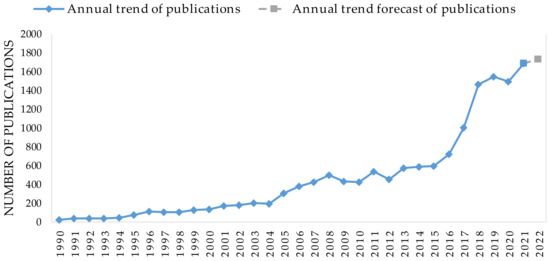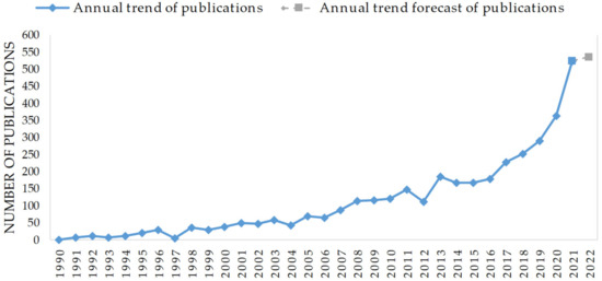 Firstly, to limit the year of literature review data, this study retrieved literature from the Web of Science and Scopus databases with XRK as the search keywords, subject as the search item, and research domain in Section 3.1 as the search domain. Figure 5 and Figure 6 show the annual trends of publications obtained from the literature search. The data of the literature search is till May 2022, so the data for 2022 in Figure 5 and Figure 6 is forecast data. Figure 5 and Figure 6 show that the annual trend of published studies in the two databases is the same. Since the turning point in 2012, the number of published studies in the two databases has been consistently over 150 and 600 since 2013 and showing an obvious upward trend. At the same time, to ensure the timeliness of the retrieved literature, the literature years were finally limited to 2013 to 2022.