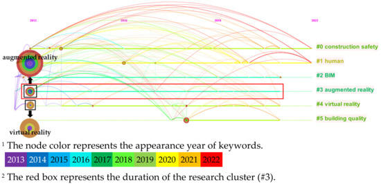 Cluster analysis can divide a large number of keywords into several research topics. The timeline analysis of keyword clustering also can consider the effect of time on research clusters. The timeline visualization of keywords can extract two types of information: (1) the first appearance year and duration of keywords and (2) the duration of the research topic. Therefore, the authors analyzed the temporal distribution of the included literature in Section 3 by timeline analysis. The timeline visualization of keyword clustering created by Citespace 5.8.R3 is shown in Figure 7. In this study, the six largest research clusters (#0-#5) were finally determined by the log-likelihood ratio (LLR) algorithm in cluster analysis. It can be seen from Figure 7 that: (1) since the two keywords “virtual reality” and “augmented reality” first appeared in two clusters (#3 and #4) in 2013, they have appeared in the included literature until 2022, which makes the keyword nodes show the characteristics of large nodes and color changes from purple to red. However, the keyword “mixed reality” did not appear in the six largest research clusters. In (2) the figure also shows the duration of each research cluster. For example, the cluster (#3) represented by “augmented reality” covers a period from 2013 to 2021, indicating a series of research results on the application of AR in construction management during these nine years. In summary, Figure 7 shows that VR/AR-related application studies have been hotspots in the construction management domain since 2013.