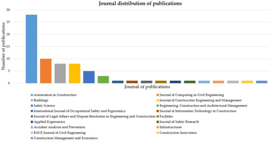 Analyzing journal sources enables the presentation of influential journals in the research domain. This study visualized the journals where the data included in Section 3 are distributed, and the visualization result is shown in Figure 8. It can be seen from Figure 8 that: studies related to the application of XR in construction management are mainly distributed in the journal of Automation in Construction, the Journal of Computing in Civil Engineering, Buildings, and the Journal of Construction Engineering and Management. This result shows that the publications in these journals can provide researchers with the latest research basis.