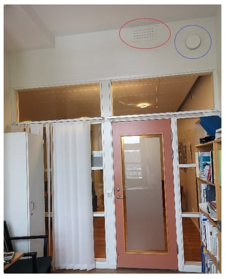 The ventilation was on from Monday to Friday between 05:00 and 18:00 and completely off at other times. The system was fan-controlled supply and exhaust air with heat recovery, i.e., FTX ventilation. The unit had a rotary heat exchanger and a heating and cooling coil. The ventilation was designed to supply 15 L/s to each office room. In the offices, there were exhaust and supply air devices for mixed ventilation, placed high up on the walls near the ceiling, as seen in Figure 2. The supply air nozzles in all rooms were directed upwards, towards the ceiling, as shown in Figure 4. The supply air temperature was configured depending on what the OT was; 20.0 °C when OT < −25.0 °C, 19.0 °C when OT between −25.0 °C–24.9 °C and 18.0 °C when OT ≥ 25.0 °C.
