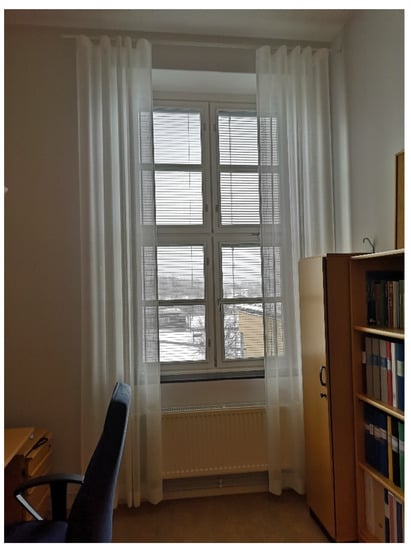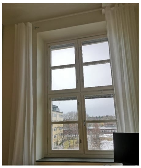 The windows in all offices were double-glazed, which were subsequently supplemented with an extra layer of glass panes made by Grundels []. The total window area per office, which consisted of four individual windows placed together as one large window, was 3.1 m2 with a total glass area of 1.7 m2. Figure 3 shows the window layout. According to [], the U-value of the windows was lowered to 1.3 W/m2·K after adding the extra glass pane, which previously was 2.9 W/m2·K. All offices were equipped with thin, almost transparent curtains on each side of the windows that extended all the way from the ceiling down to the floor, thus covering the elements that were placed under the windows. The detailed information about the curtains can be found in Table 2. The south-facing rooms also had blinds inside each of the four individual windows. There was no external shading. There were no trees outside the offices that cast shadows on the windows, and on the south side, there were no other buildings that cast shade. On the north side, room C(n) was shaded by a part of the building in the afternoon (to the left side), which meant that it received almost no direct sunlight; see Figure 1.