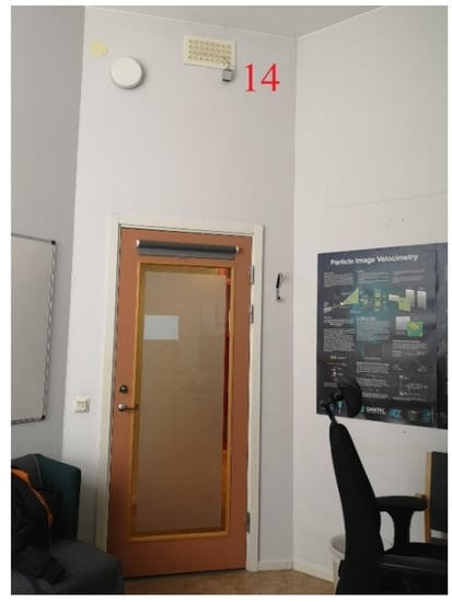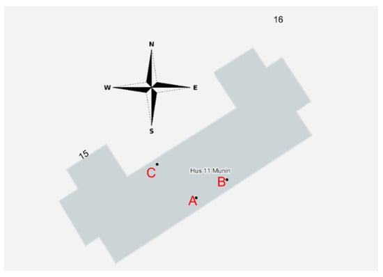 According to AFS 2020:1 [], the minimum accepted supply ventilation flowrate for each room should be around 10.7 L/s (calculated based on 7 L/s and 0.35 L/s·m2 floor area). This corresponds to an air turnover of ≈1.07 h−1. The measurements were carried out in the month of April. Figure 5 shows the room and building orientation. The figure also shows the two loggers that are marked as 15 and 16 as well, which is where outdoor measurements were taken, and they are listed in Table 3.