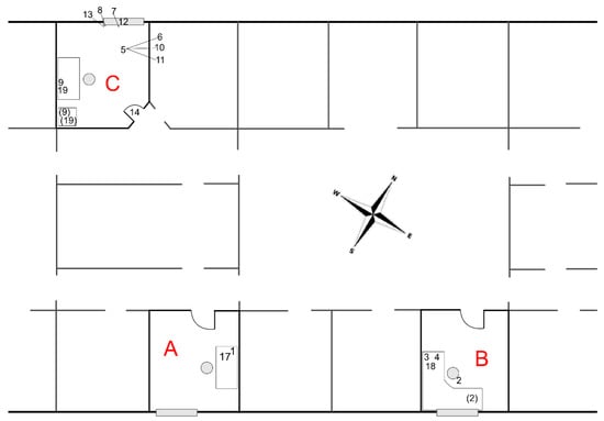 The measurements were performed in April. Figure 1, Figure 5, and Figure 6 show the three rooms where the measurements were performed and where these rooms are located in the building, as well as the cardinal directions of each room. The information about the two loggers marked in Figure 5 can be found in Table 3.