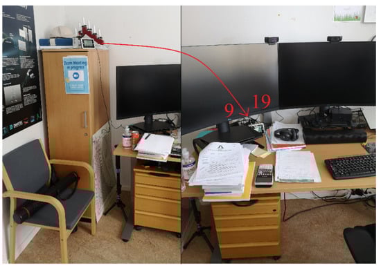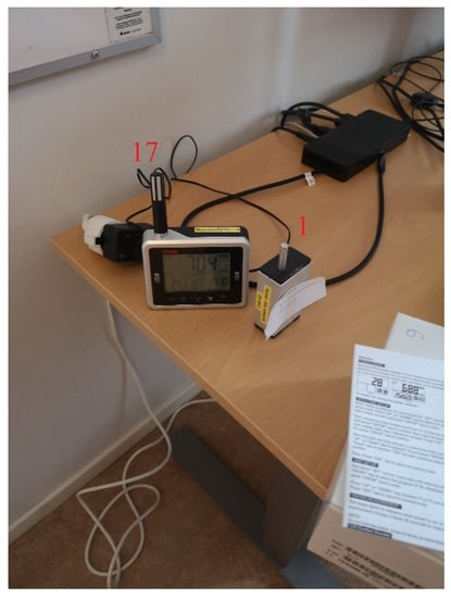 In room A, the person could control the radiator and sunshade freely. Some type of sun protection was always used. The blinds were usually pulled down and angled horizontally, and the curtains were half drawn, as shown in Figure 7. On sunny days, however, the sunshades were used to a greater extent. In the room, logs 1 and 17 were placed on the desk to the left of the two computer screens at a height of 0.8 m (see Figure 8). However, the interval on logger 17 had been forgotten to be specified and it was set to 10 sec previously.