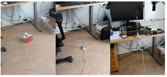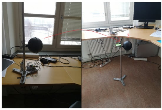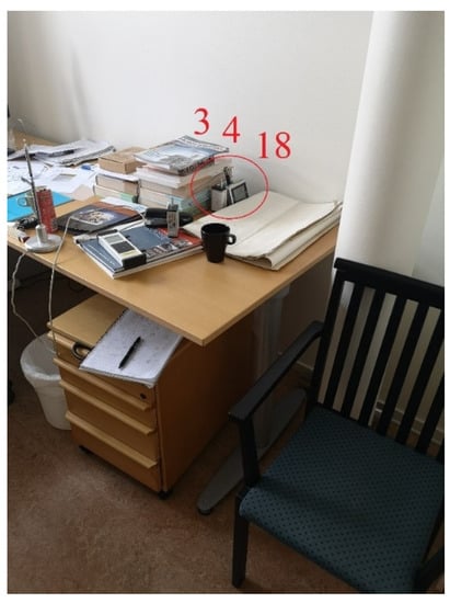 In room B, the radiator thermostat was on the highest setting (max 3), and the staff usually worked from home. In room B, loggers 3 and 18 were set up on the desk at a height of 0.8 m, with the right side of the computer screen against the wall (see Figure 9). The globe thermometer 2 was also set up on the desk in front of the window at a height of 1.08 m with an interval of five minutes. Two identical loggers were used here: 3 and 4. The difference between these was the measuring interval, which was set to 5 and 15 min respectively. In order to compare the globe thermometer in room B with the one in room C, globe thermometer 2 in this room was moved to the floor a few days after it was on the desk. It was placed at a height of between 0.7 m and 0.9 m from the window wall in front of the desk. See Figure 10 for the location of the globe thermometer before and after it was moved. The next day, the desk was lowered to 0.7 m, so that half of the globe thermometer ended up above the desk and therefore became more sunny. This meant that the log on the desktop was also lowered.