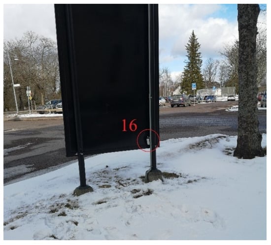 The loggers 15 and 16 were placed outdoors. The logger 15 was placed on a windowsill facing northwest on the 3rd floor, that is, the floor below the rooms where the measurements were performed. The logger was shaded all day except in the evenings. In addition, the logger 16 was placed on the back of a sign that was located north of the building (see Figure 13). The logger’s location was exposed to sunlight for approximately four hours in the morning and two hours in the afternoon.