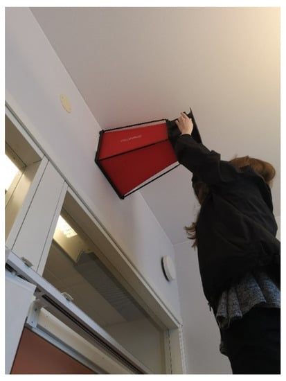A SwemaFlow airflow probe from Swema AB was used to measure the ventilation flows. This device can measure air flows between 1.5 and 125 L/s with a measurement uncertainty of 3% ± 0.5 L/s. The measurements were carried out on one occasion in all three rooms on the supply air devices. Figure 14 shows the measurement of the supply air flow. The plug was placed over the device, and a reading of the flow was taken. During the measurements, the doors were closed.