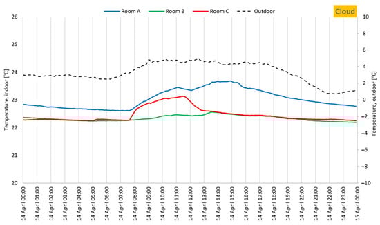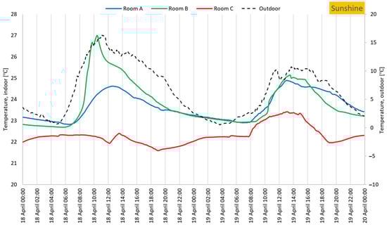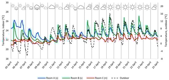 The temperatures indoors and outdoors follow each other to some degree; that is, there was an increase in the indoor temperature when it got warmer outside, as can be seen in Figure 16. The temperature in room A was very high on April 5–6, but the reason for this was that the thermostat was set to maximum, and then it was lowered on April 7. Room C, in the north direction, had the lowest temperature for almost the entire period and usually stayed below 23 °C. In addition, room B had the highest temperature during the peaks. Both rooms A and B reached higher temperatures than 24 °C during the measurement period—24.2% and 20.6% of the measurement period, respectively. The temperature in room B also reached above 26 °C on certain occasions, which amounted to 1.6% of the total measurement period. The weather notes shown in Figure 16 have been recorded from 09:00 to approximately 16:00 during the day. The result for the air temperature in the study shows that it does not completely stay within the existing guidelines. None of the rooms gets below 20 °C, which is good, but on the other hand, both south-facing rooms (A and B) get temperatures above 24 °C about 20% of the time, which is the highest value during the winter according to ANSI/ASHRAE Standard 55-2017 []. Since there is no cooling equipment installed in these rooms, the overheating of the rooms in the south direction will only get worse when the outdoor climate gets warmer, i.e., during summertime.