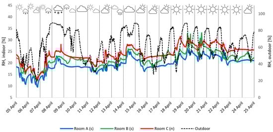 Comparison of indoor and outdoor RH and symbols of weather, with the indoor RH of the three rooms shown on the left axis and the outdoor RH on the right axis.