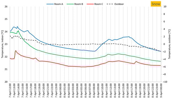 Comparison of temperature outdoors and indoors in all three rooms for 1.5 days when it was snowing outside. The indoor temperature of the three rooms is shown on the left axis, and the outdoor temperature is shown on the right axis.