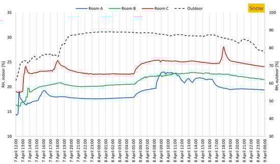 Comparison of RH outdoors and indoors in all three rooms for 1.5 days when it was snowing outside. The indoor RH of the three rooms is shown on the left axis, and the outdoor RH is shown on the right axis.