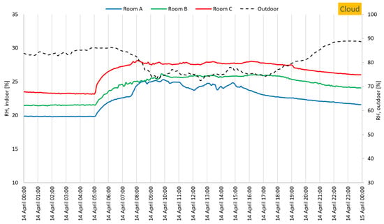 Comparison of RH outdoors and indoors in all three rooms for 1 day when it was cloudy outside. The indoor RH of the three rooms is shown on the left axis, and the outdoor RH is shown on the right axis.