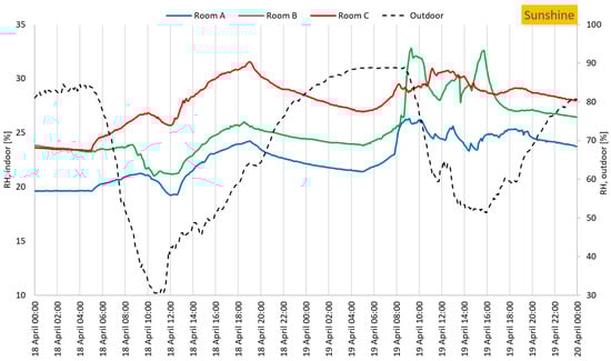 Comparison of RH outdoors and indoors in all three rooms for 2 days when it was sunny outside. The indoor RH of the three rooms is shown on the left axis, and the outdoor RH is shown on the right axis.