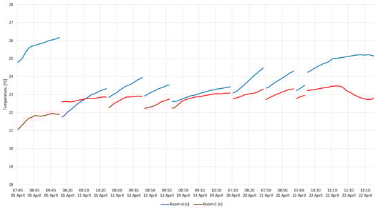 Figure 24 shows the air temperature for room A in the south orientation and room C in the north orientation during the times when there is a presence of people in both rooms. The result shows that the room in the south orientation has a higher air temperature most of the time than the one in the north orientation. The reason why room A had such a high temperature during the first period, i.e., April 5, was because the thermostat was set to maximum that day. When comparing days between cloudy and sunny days, the results show that on cloudy days (April 14), the temperature gap is small between the room and on sunny days (April 22), this gap is increased. The increase in temperature and its impact on the overall thermal comfort, depending on which direction the room is facing, was also shown by Bakhtiari et al. [], who studied similar office rooms in an old building in the city of Gävle, Sweden.