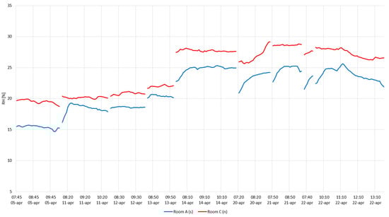 Figure 25 shows the relative humidity during the same period, and it can be seen that in the room facing north (Room C), it is always higher than in the room facing south, between 2–4% higher.