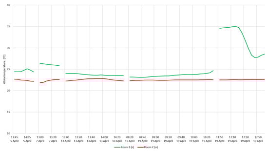 Shows the globe temperature on occasions when people are present in rooms B and C.