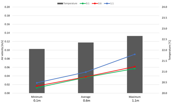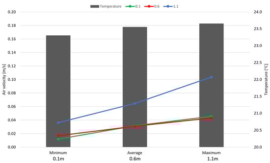 The air velocity measurements are shown in Figure 27 for room C(n) and Figure 28 for room B(s). The air velocity for the three heights is relatively similar in the room B(s) and C(n). The measurements at 0.1 m and 0.6 m were very similar to each other for both rooms. The highest velocities measured were at 1.1 m and the lowest at 0.1 m in both rooms. The average values for 0.1 m and 0.6 m both in north and south orientation were 0.03–0.04 m/s. For 1.1 m, it was 0.05–0.06 m/s. The maximum value for room B(s) was 0.1 m/s, and for room C(n) it was 0.09 m/s, both at 1.1 m height. The temperature was lower at lower heights and increased slightly at higher elevations. The temperature ranged between 22.1–22.7 °C for room C(n) and 23.3–23.7 °C for room B(s).