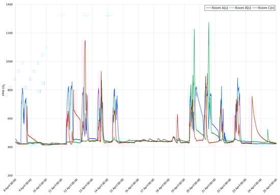 Results for CO2 measurements during April 8 –24 for Rooms A(s), B(s), and C(n).